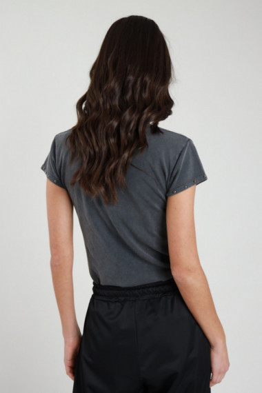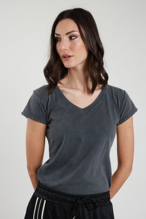 T-Shirt in Cotone Elasticizzato Effetto Slavato con Scollo a V e Borchie nel Giromanica.