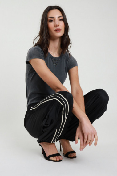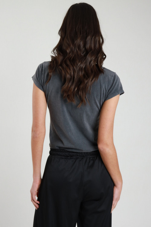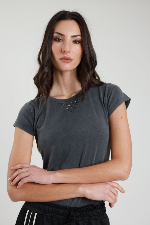 T-Shirt in Cotone Elasticizzato Effetto Slavata, Girocollo con Dettaglio Borchie.