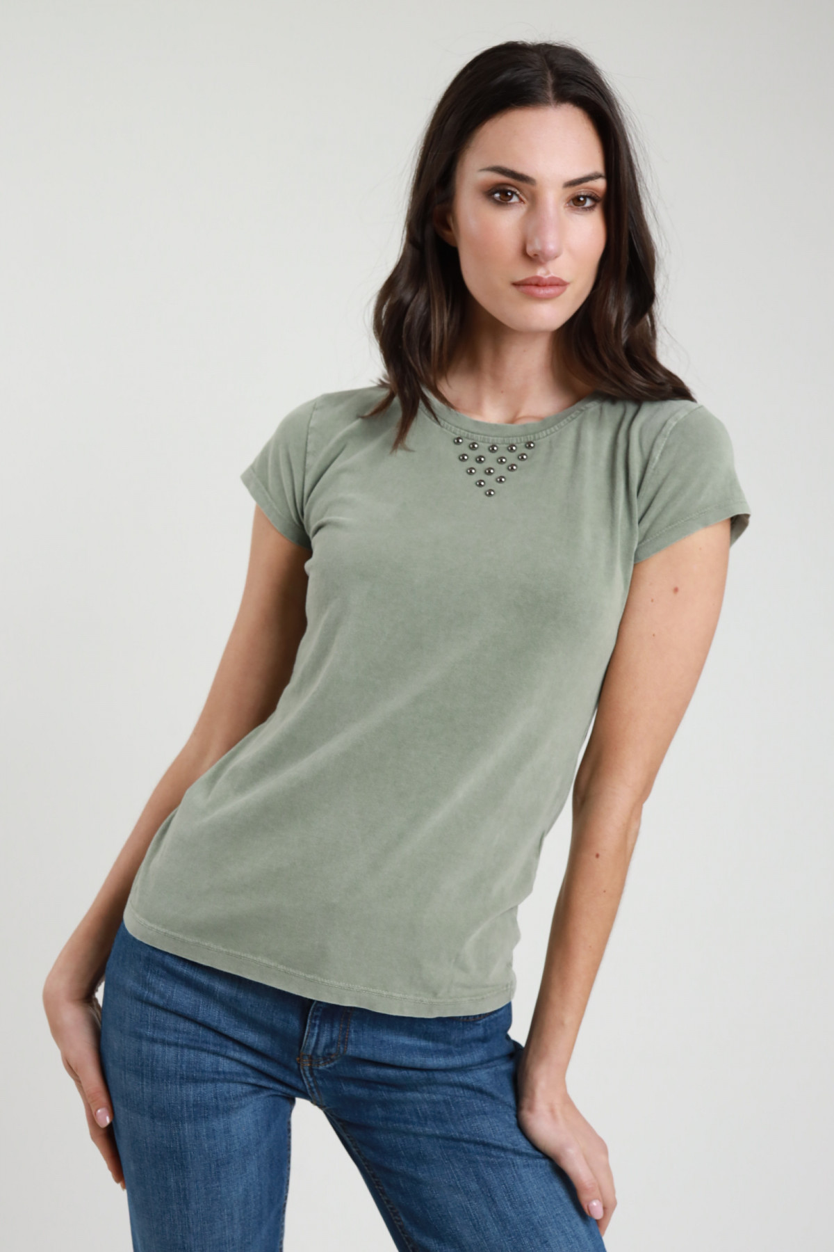 T-Shirt in Cotone Elasticizzato Effetto Slavata, Girocollo con Dettaglio Borchie.