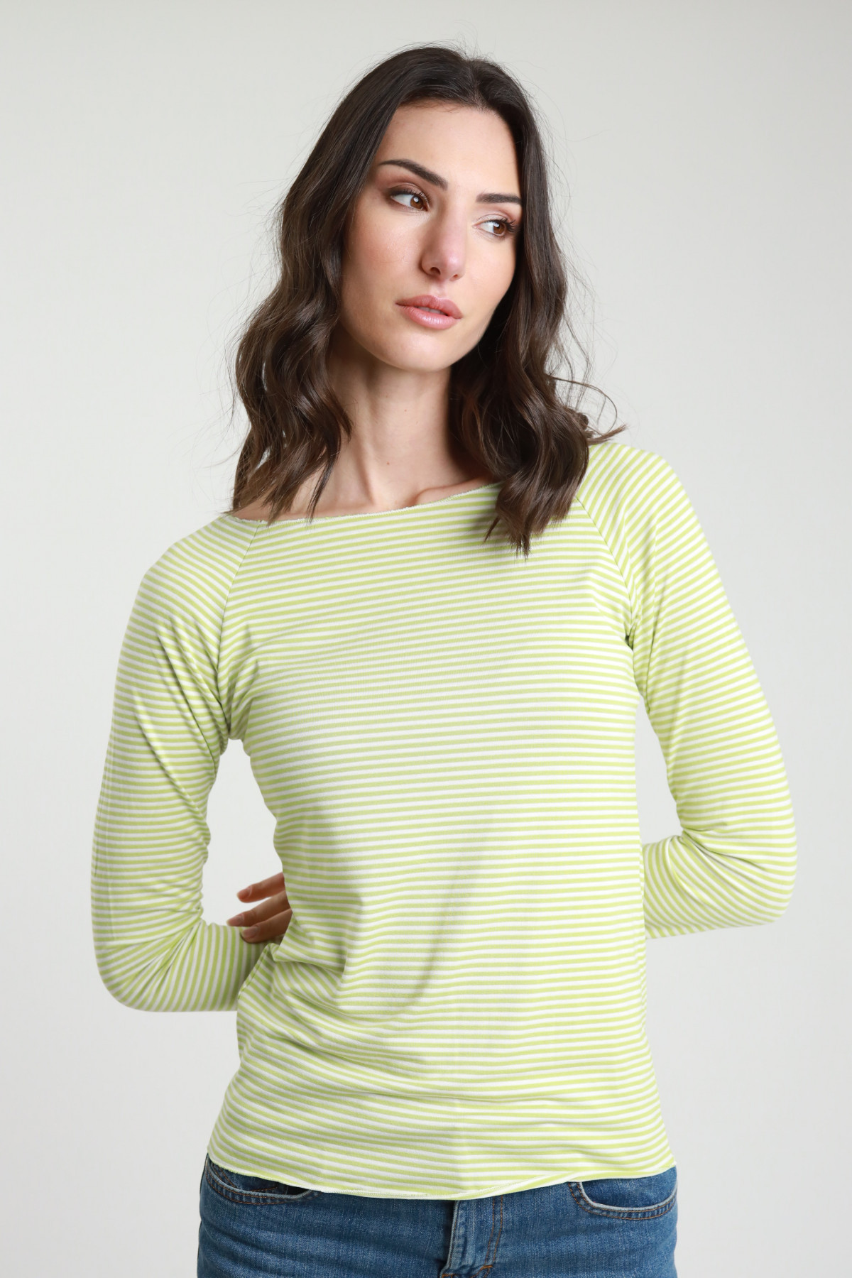 T-shirt Elasticizzata Maniche Lunghe, Scollo Barchetta a Righe.