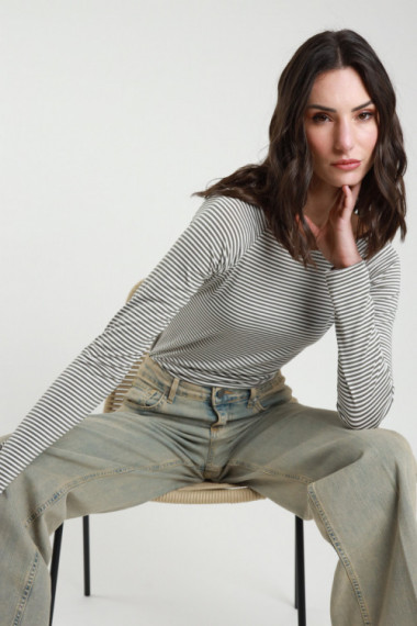 T-shirt Elasticizzata Maniche Lunghe, Scollo Barchetta a Righe.