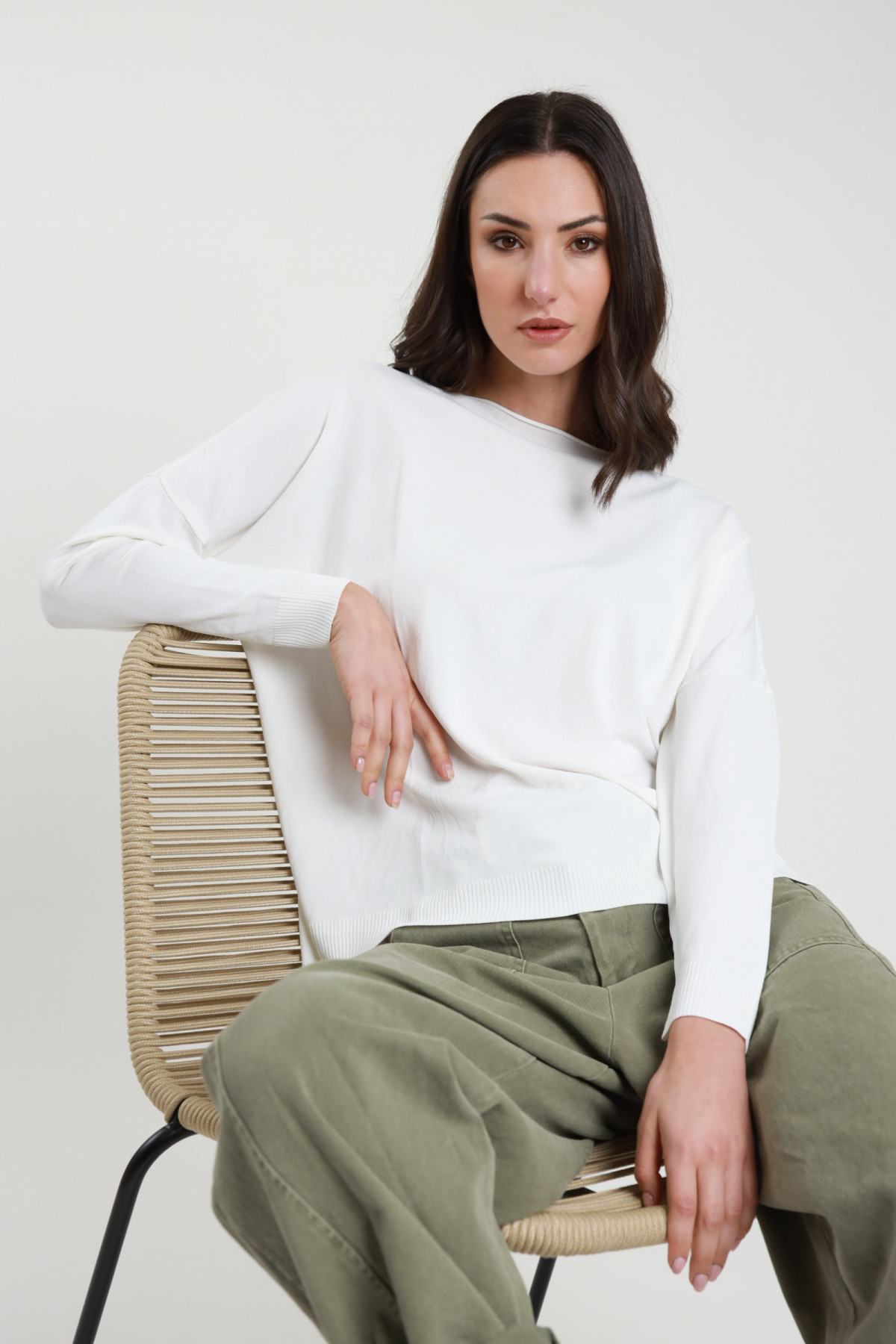 Maglia Over Scollo a Barca con Taglio Vivo e Costine sui Polsini e sul Fondo, Spacchi Laterali.