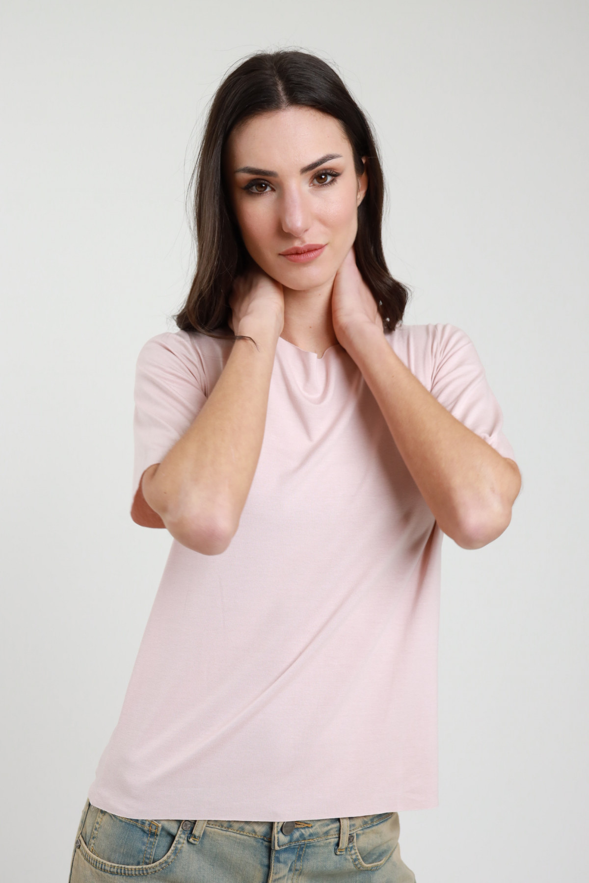 T-Shirt Girocollo in Viscosa Elasticizzata con Taglio Vivo e Mezze Maniche Lunghe.
