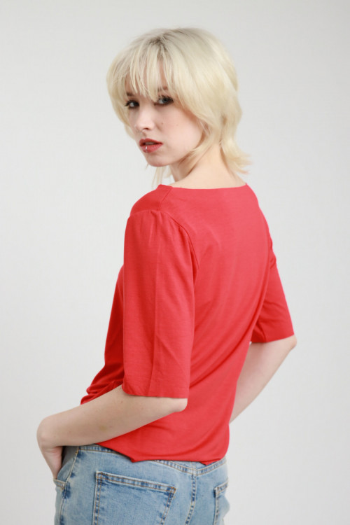 Maglia in Viscosa Elasticizzata con Maniche 3/4 e Cut-Out sulla Spalla con Accessorio Dorato.