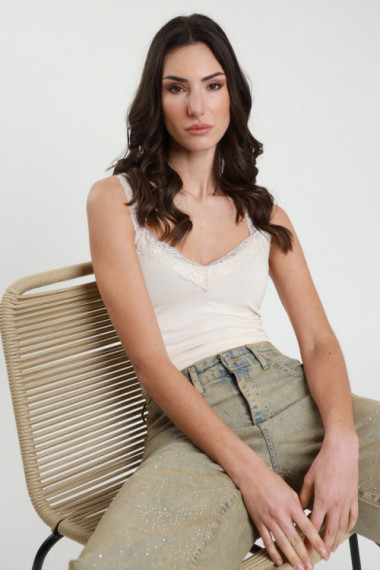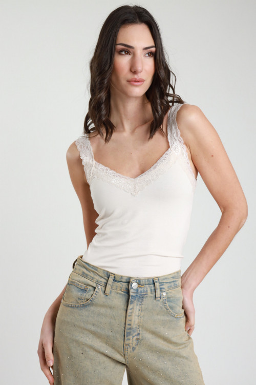 Canotta Canettata Con Scollo Tondo e Spalline Strette, Borchiette In Strass Apllicate. 95%co 5%ea