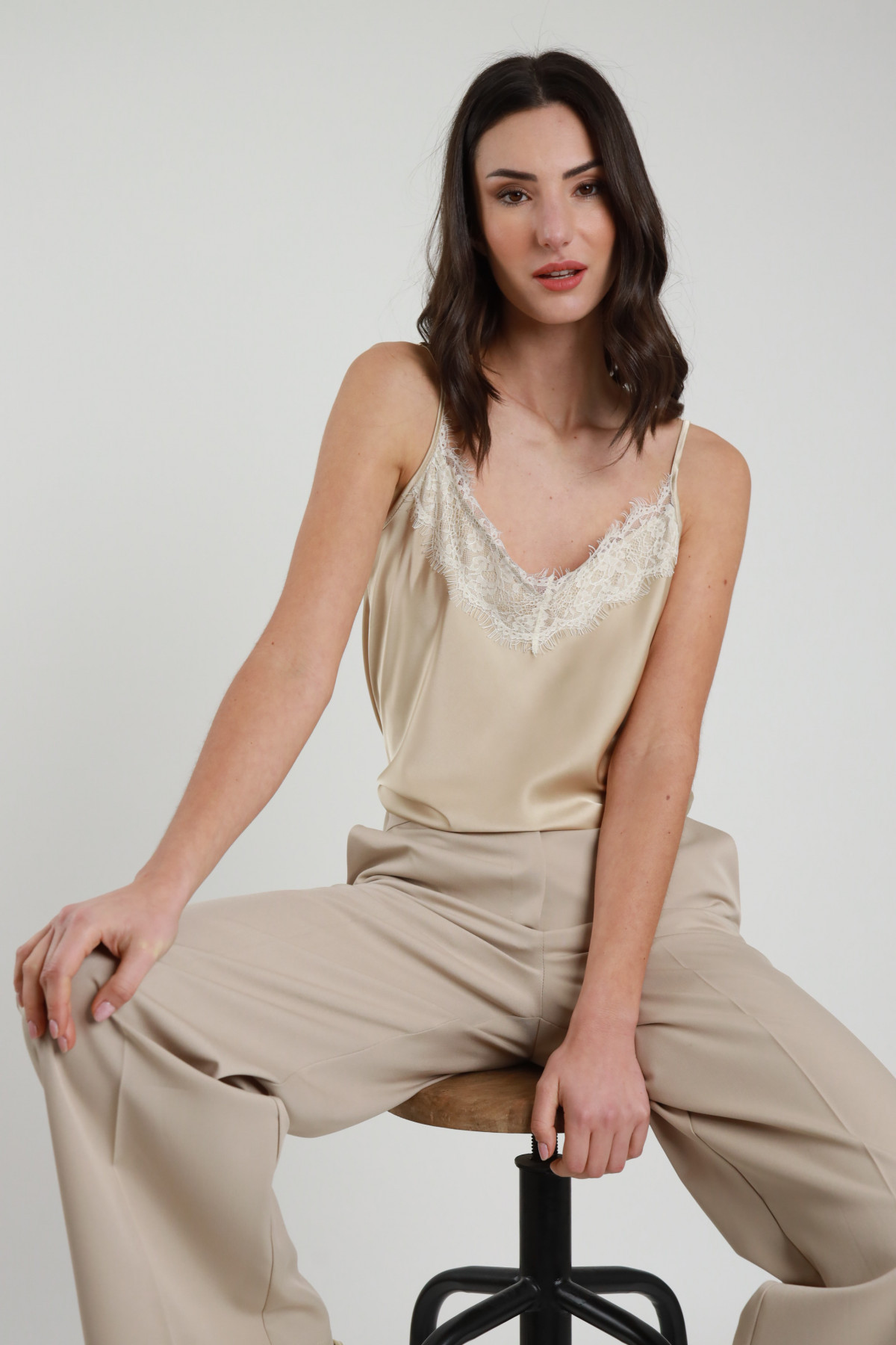 Top Satinato in Pizzo con Scollo a V e Spalline Sottili. Fondo Lungo Asimmetrico.