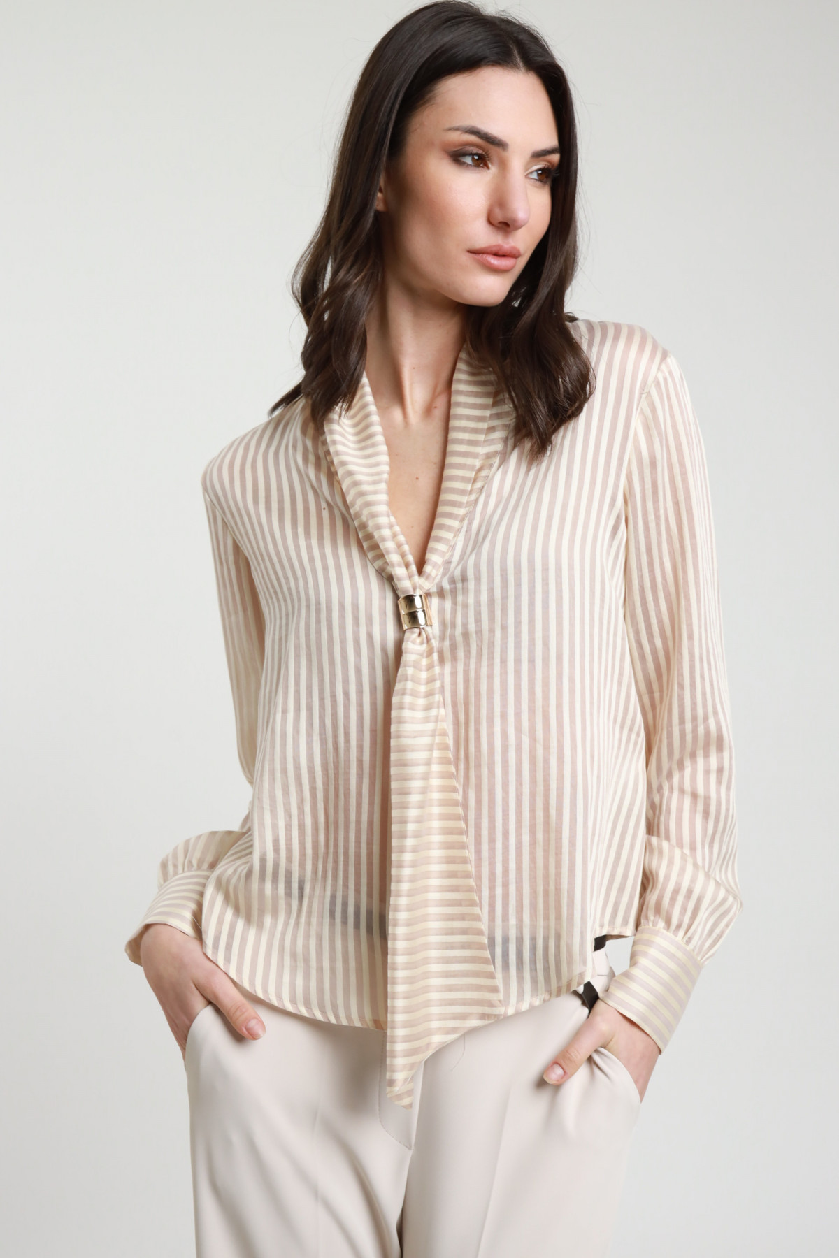 Blusa Gessata Ton sur Ton con Cravattina e Dettaglio Dorato.