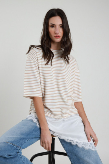 T-Shirt Oversize con Manica Extra, Girocollo in Fantasia Rigata con Sottoveste con Pizzo Sul Fondo.