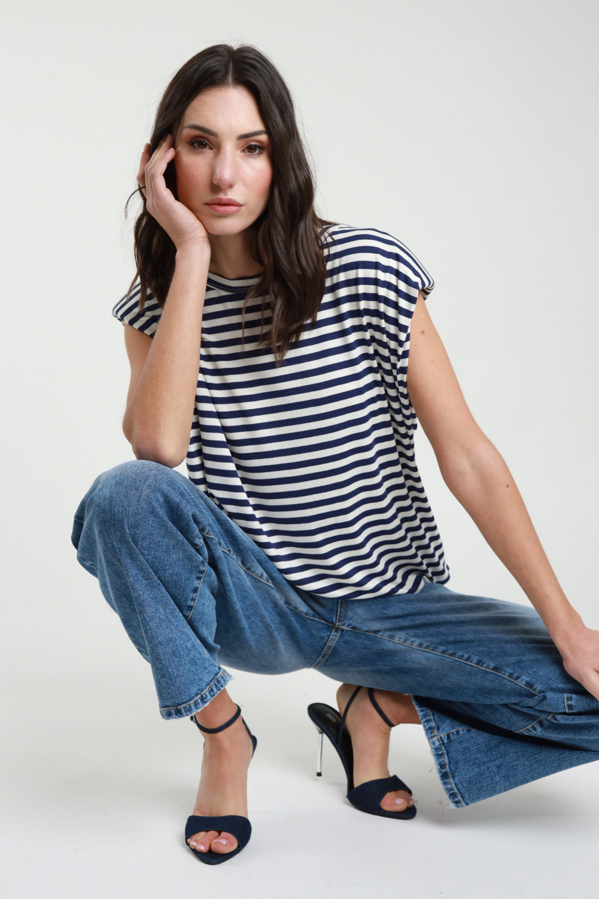 T-Shirt Over Smanicata in Viscosa Elasticizzata con Spalline Imbottite, in Fantasia Righe.