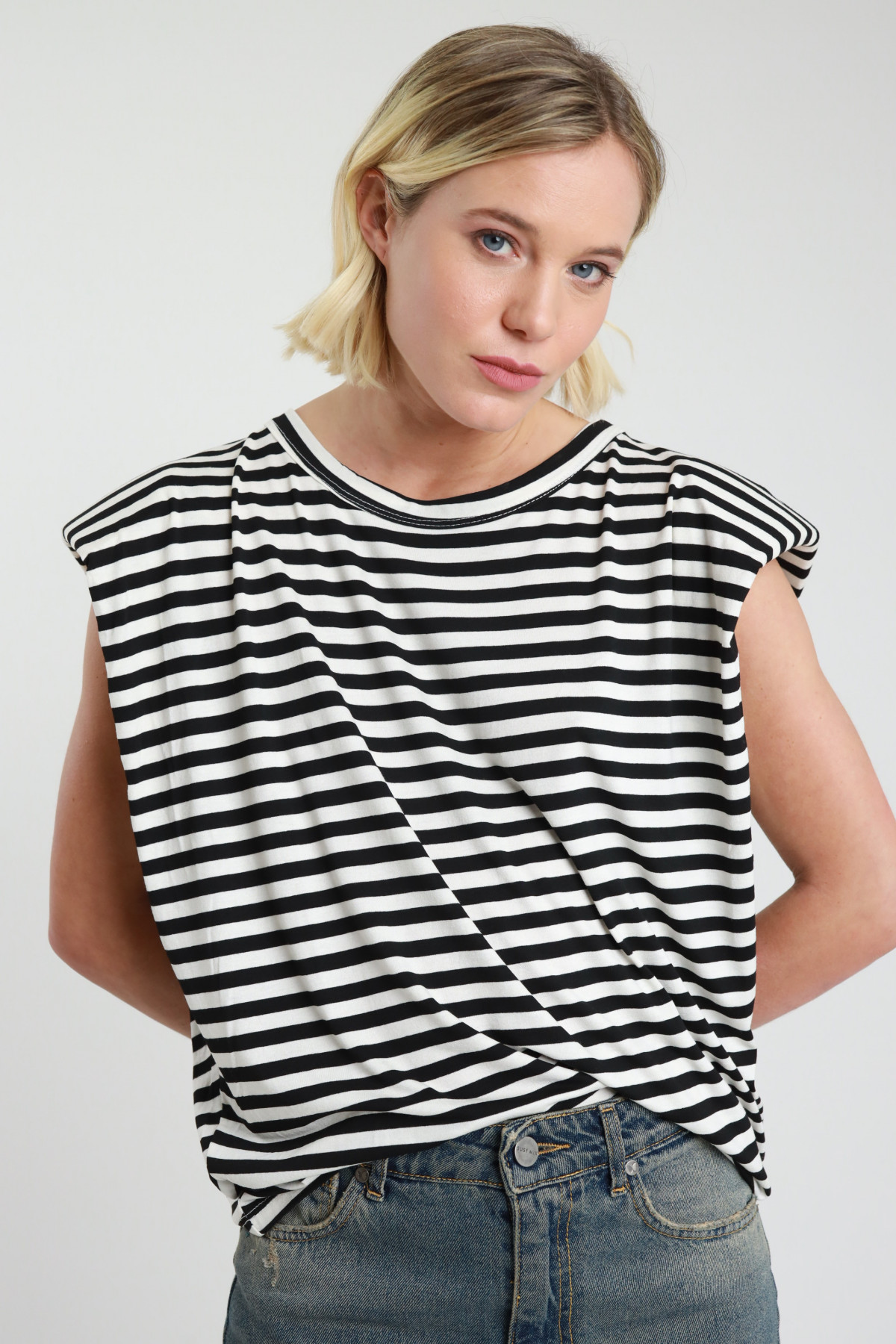 T-Shirt Over Smanicata in Viscosa Elasticizzata con Spalline Imbottite, in Fantasia Righe.