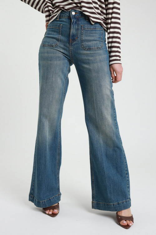 Flare-Jeans aus Stretch-Baumwolle, leicht marmorierte Waschung, Pattentaschen auf der Rückseite. 98 % CO 2 % Stück