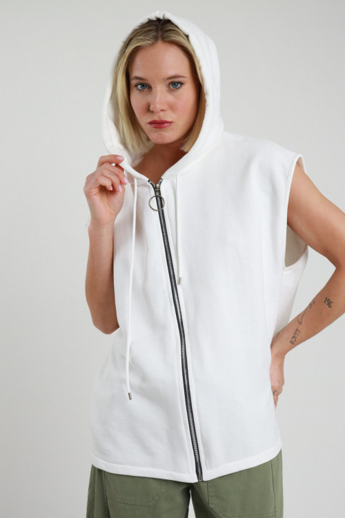 Felpa Smanicata con Chiusura Zip sul Fronte e Cappuccio, Dettaglio Stampa e Strass sul Retro.