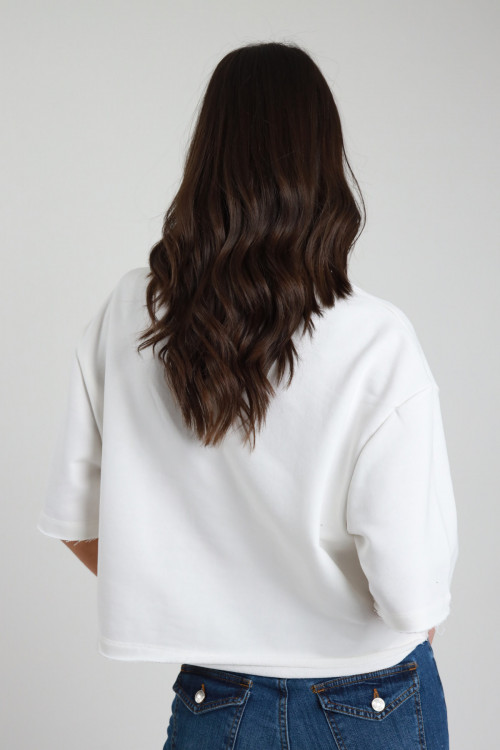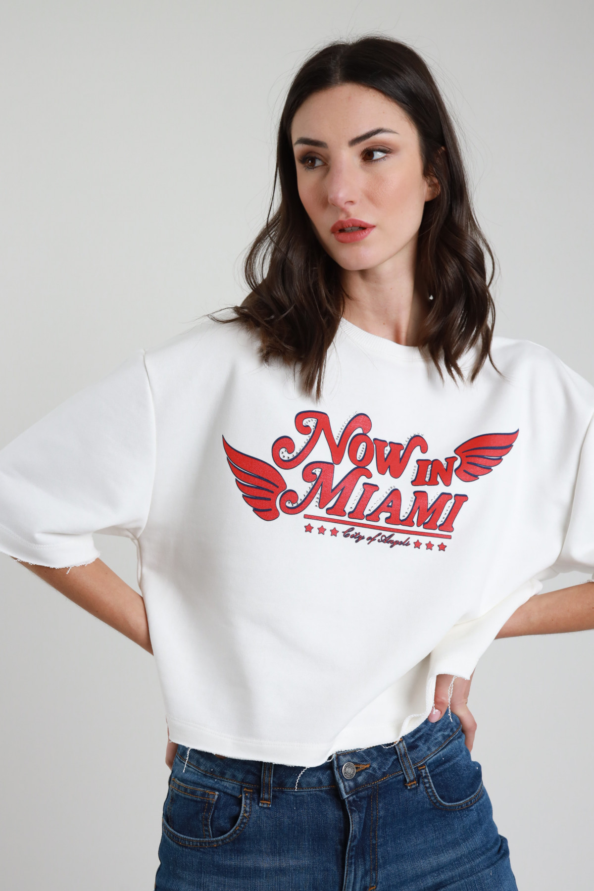 Felpa Over Crop Taglio Vico con Stampa Scritta New In Miami con Strass Applicati.
