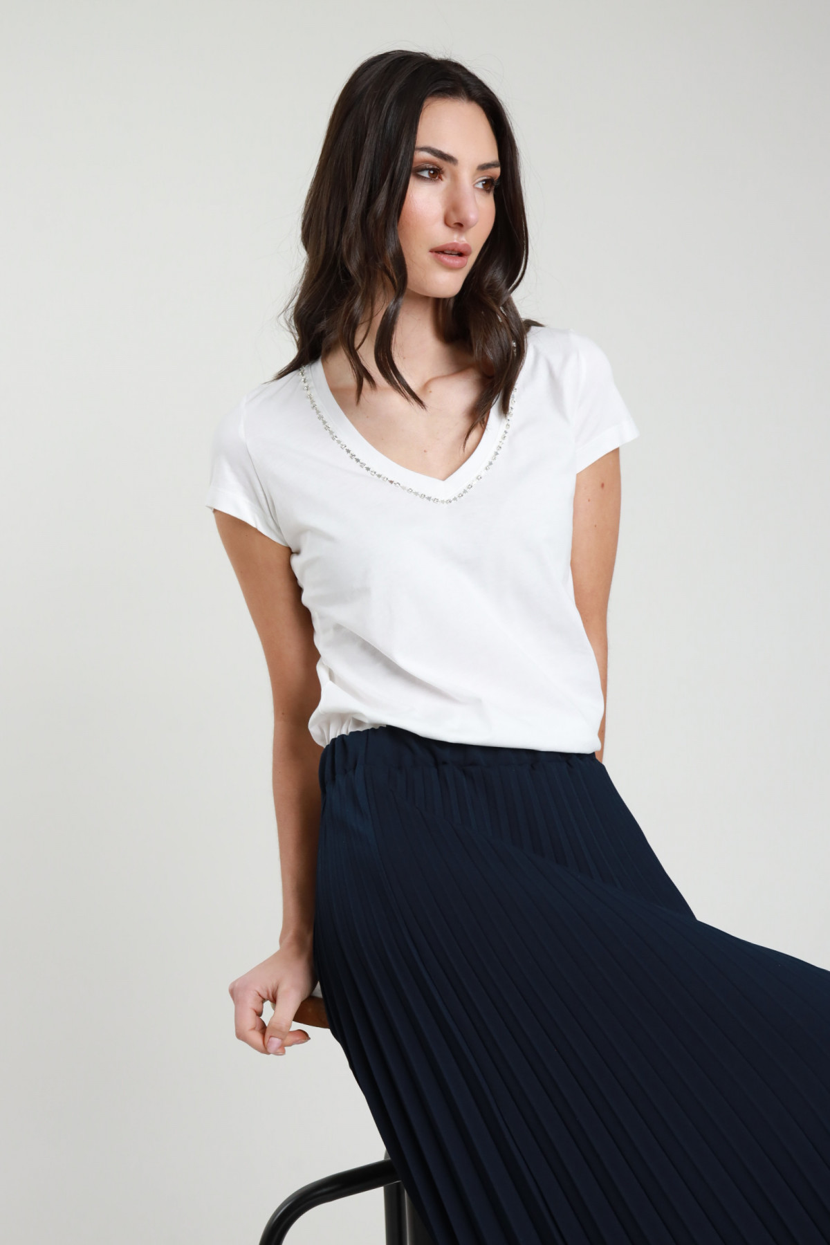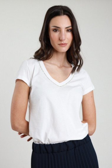 T-Shirt Mezze Maniche in Cotone, Scollo a V con Dettaglio Gioiello Strass e Stelline.