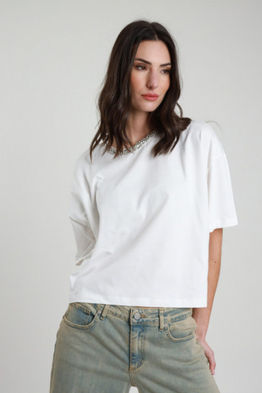 T-shirt in Cotone Corta a Mezza Maniche con Girocollo Gioiello e Bottone sul Retro.