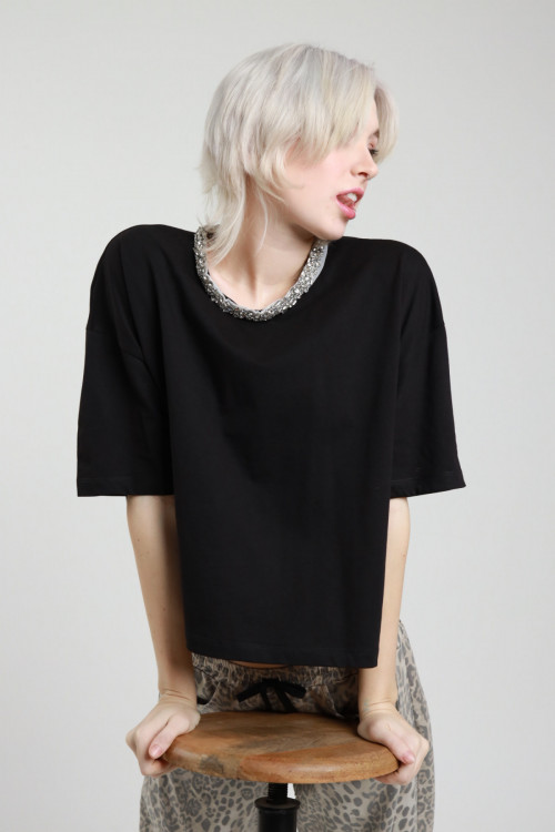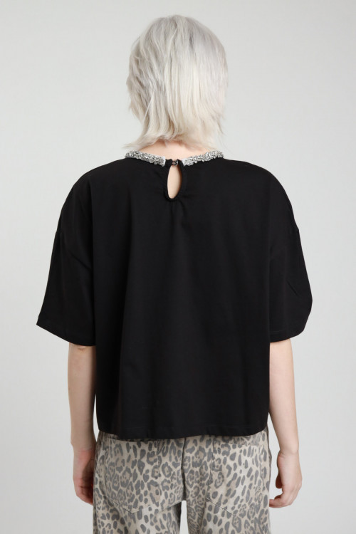 T-shirt in Cotone Corta a Mezza Maniche con Girocollo Gioiello e Bottone sul Retro.