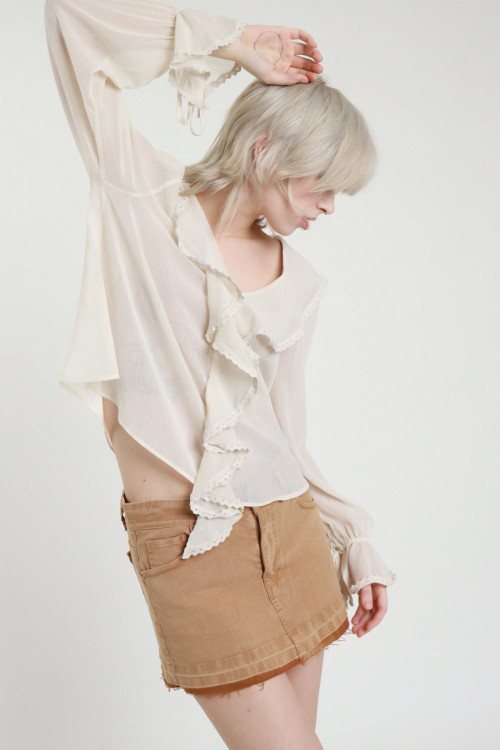 Blusa Scollo a V in Trasparenza con Rouges sul Davanti e Elastico e Volant sui Polsi. 100%pl