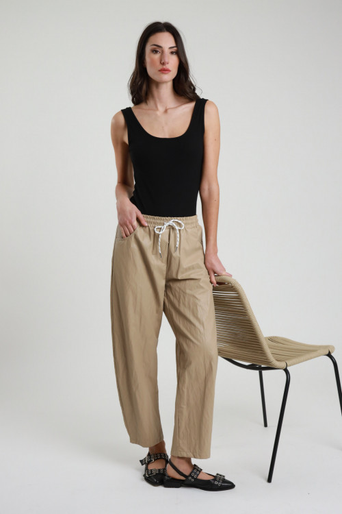 Pantalone Ovetto Ecopelle, Con Banda Elastica e Nastro A Contrasto. Gamba Dritta. 70%vi 14%pl 10%co 6%me+100%pl