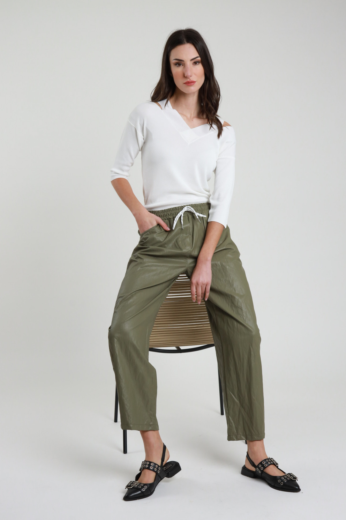Pantalone Ovetto Ecopelle, Con Banda Elastica e Nastro A Contrasto. Gamba Dritta. 70%vi 14%pl 10%co 6%me+100%pl