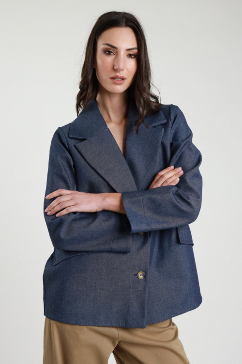Giacca Over in Doppio Tessuto con Tasche Pattine e Dettaglio Spilla Gioiello, Maniche a Sbuffo Effetto Raso con Bande Laterali e Polsini Elastici. Chiusura Regolabile sul Retro.