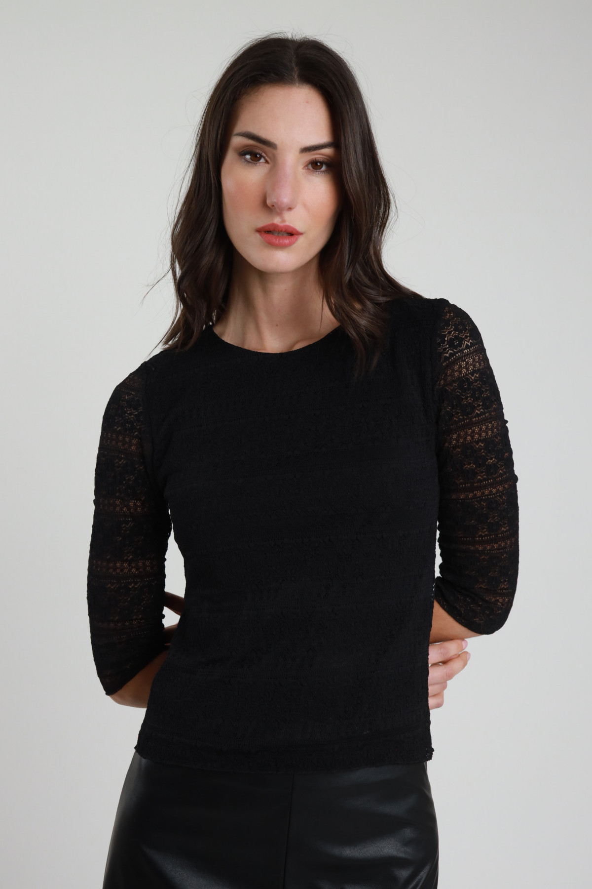 T-shirt in Pizzo Elasticizzato con Maniche 3/4 in Trasparenza, Girocollo.