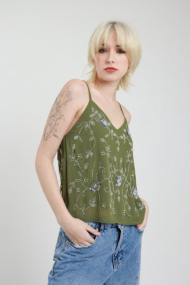 Canotta Ricamata con Perline, Spallina Stretta Regolabile, Taglio Morbido Crop. 100%pl