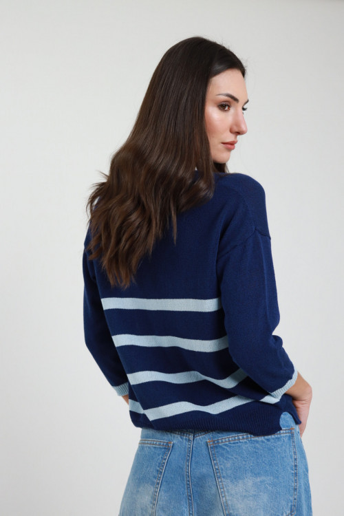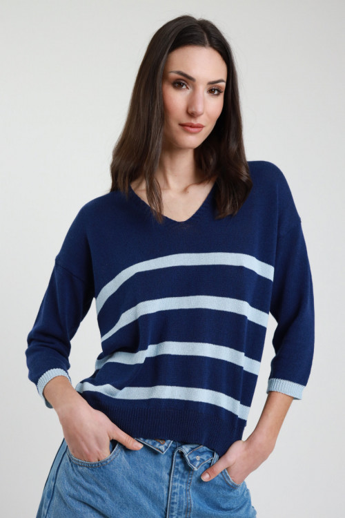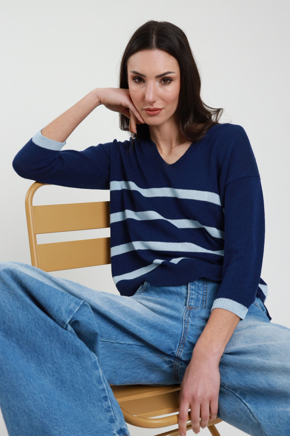 Maglia Spalla Scesa, con Scollo a V in Fantasia Rigata.