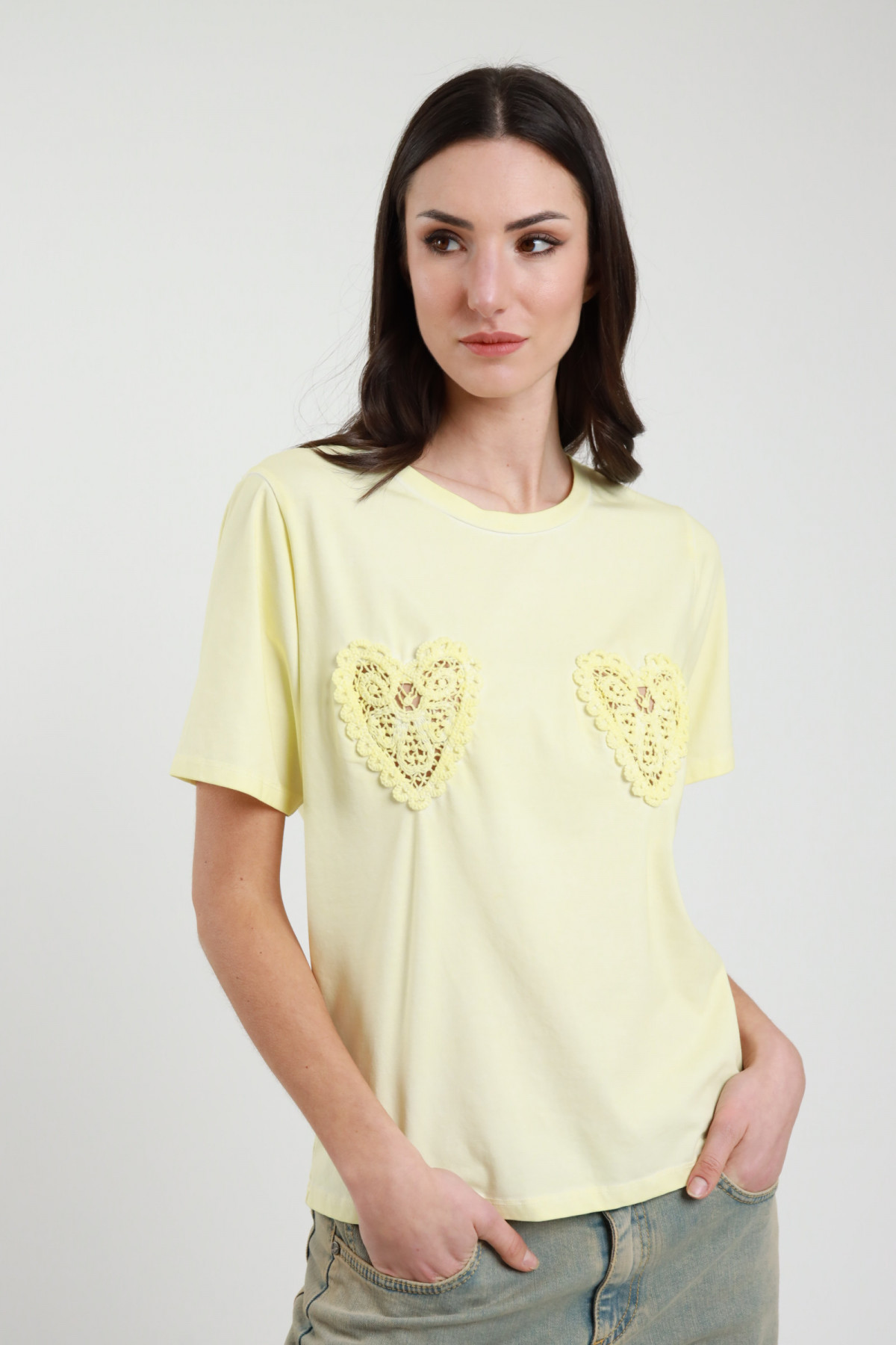 T-Shirt a Mezze Maniche Girocollo con Cotone Elasticizzate e Dettaglio Applicazioni Cuori in Crochet.