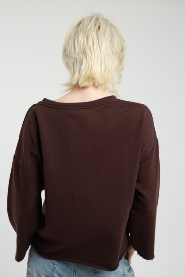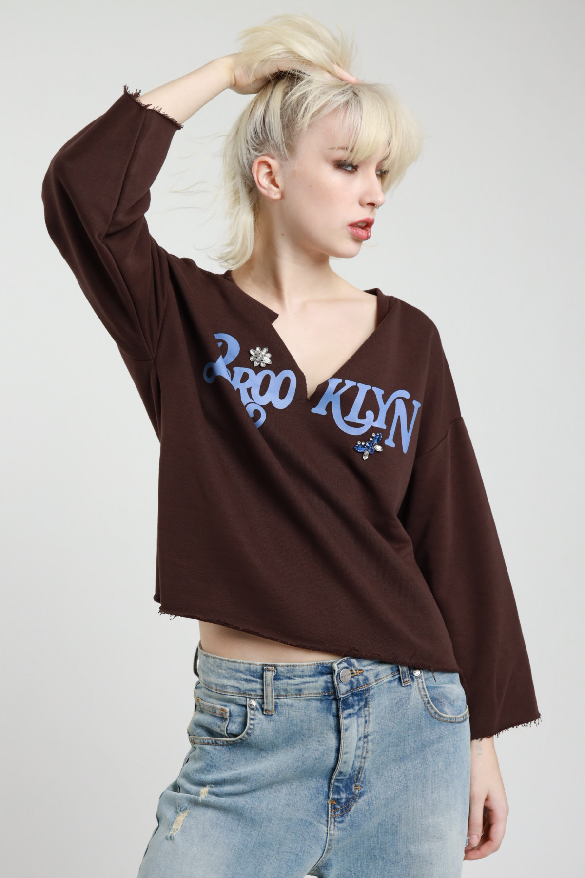 Felpa Con Taglio A V Sullo Scollo, Cabochon, Scritta Brooklyn, Fit Scatoletta e Taglio Vivo Sul Fondo e Maniche. 65%co 35%pl