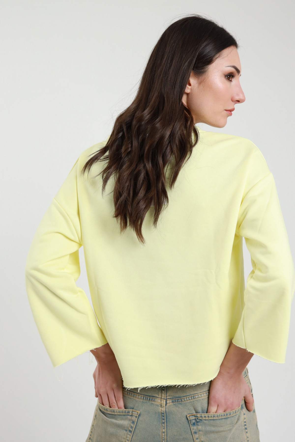 Felpa Con Taglio A V Sullo Scollo, Cabochon, Scritta Brooklyn, Fit Scatoletta e Taglio Vivo Sul Fondo e Maniche. 65%co 35%pl