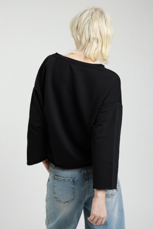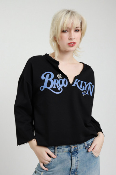 Felpa Con Taglio A V Sullo Scollo, Cabochon, Scritta Brooklyn, Fit Scatoletta e Taglio Vivo Sul Fondo e Maniche. 65%co 35%pl