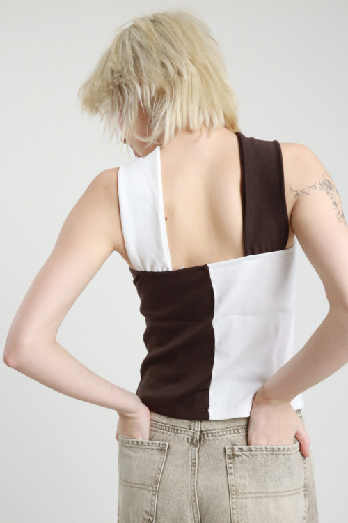 Top a Fascia Asimmetrico, in Ecodainetto, con Chiusura Zip sul Retro.