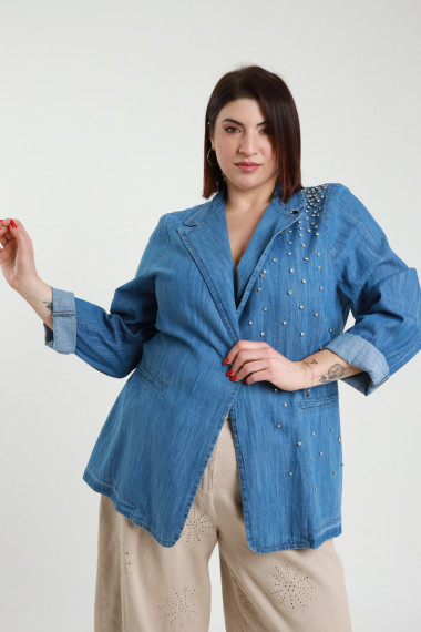 Blazer Monopetto in Denim con Applicazione Strass Laterale, tasche Filetto - Linea Curvy Susy Star.