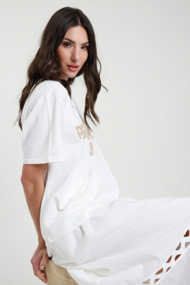 T-Shirt Over Girocollo Maniche Corte con Raglan in Pizzo e Alamari.
