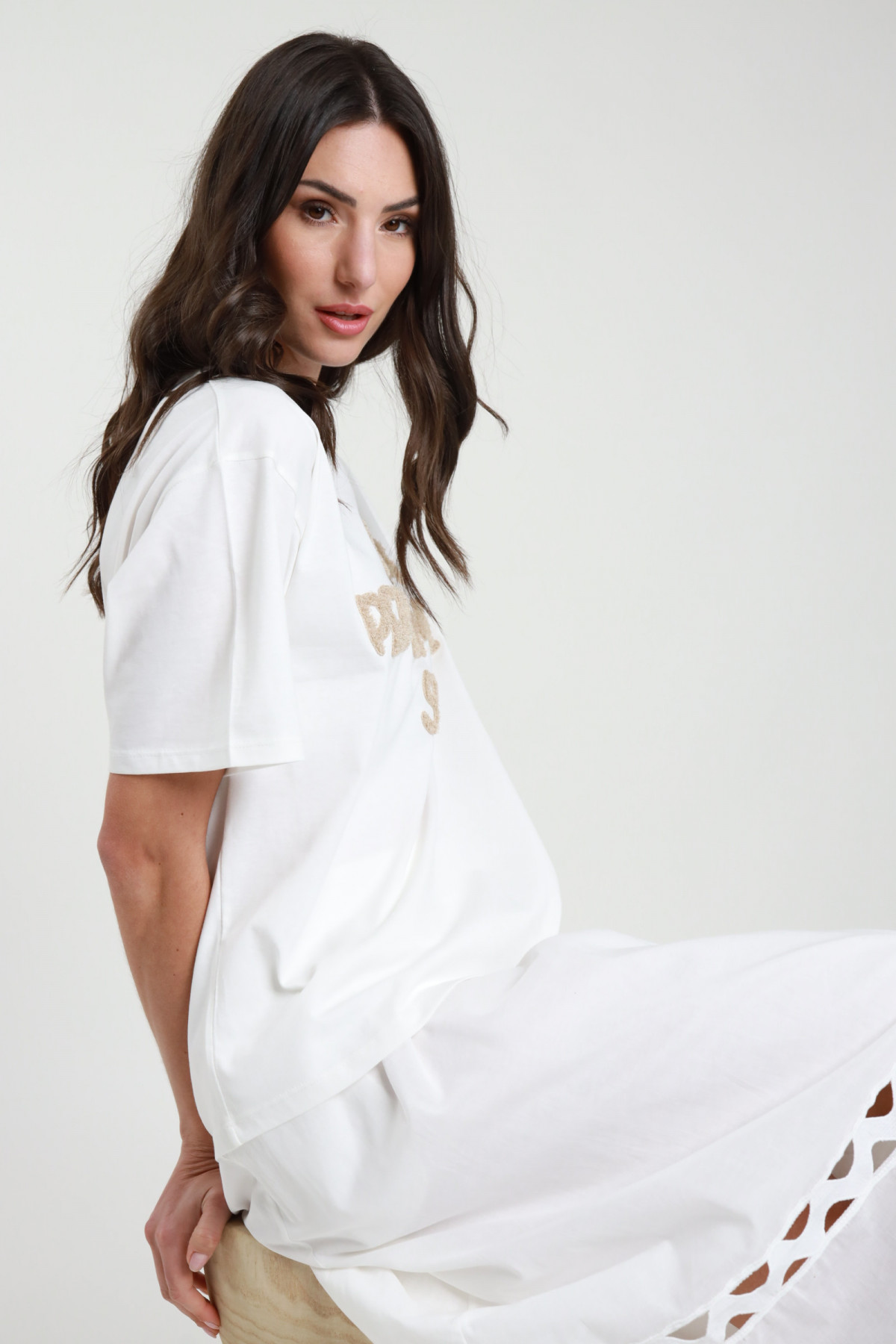T-Shirt Over in Cotone con Ricamo Scritta in Bouclè "Sarà per Sempre Si".