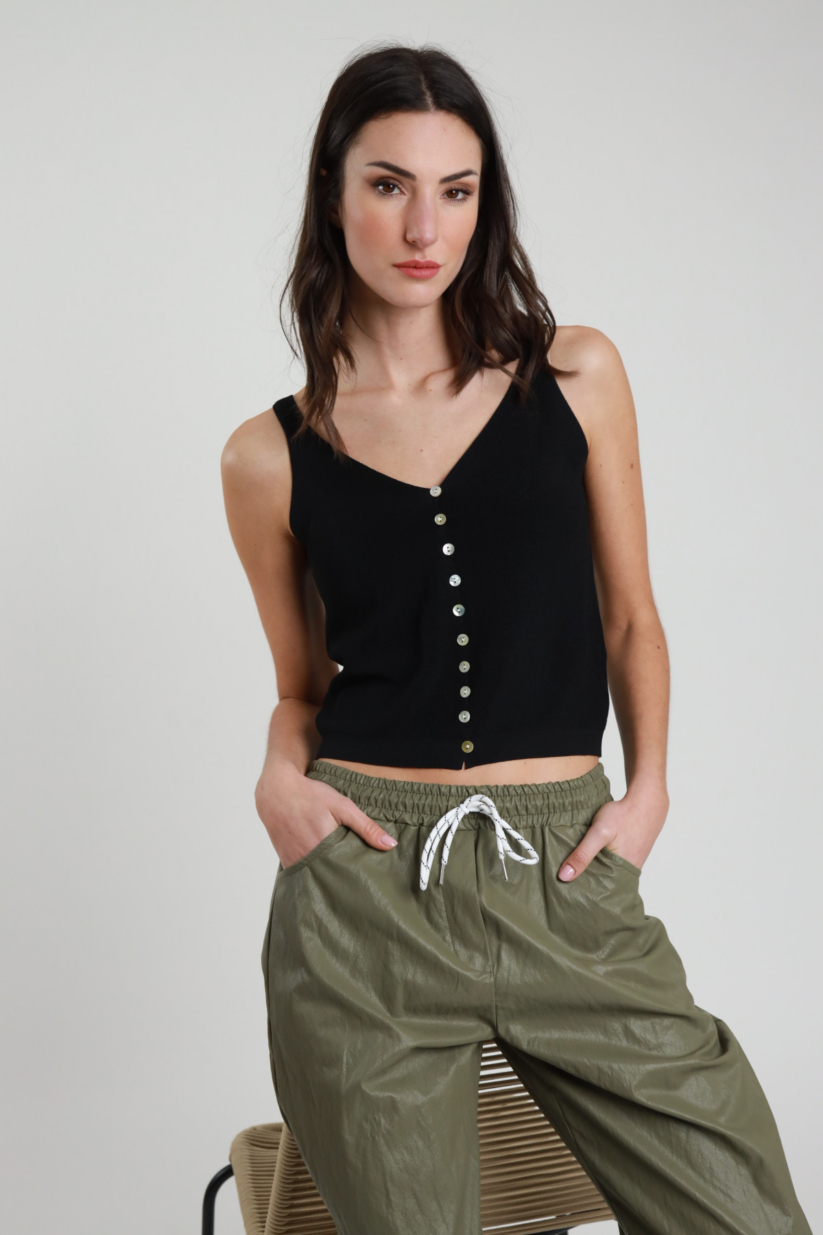 Canotta In Maglia Scollo V Con Bottoncini Sul Fronte.