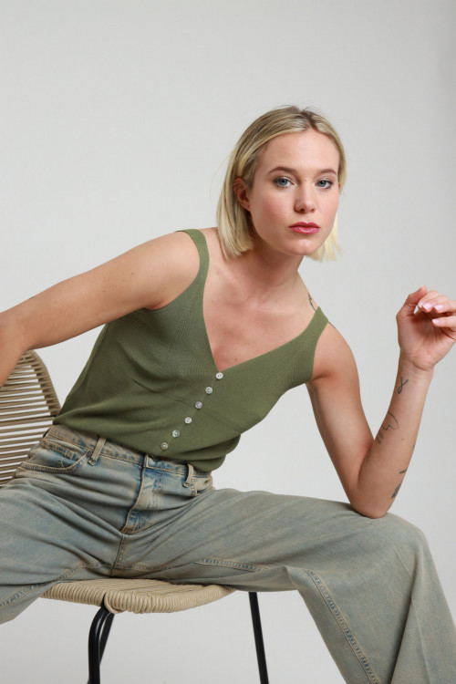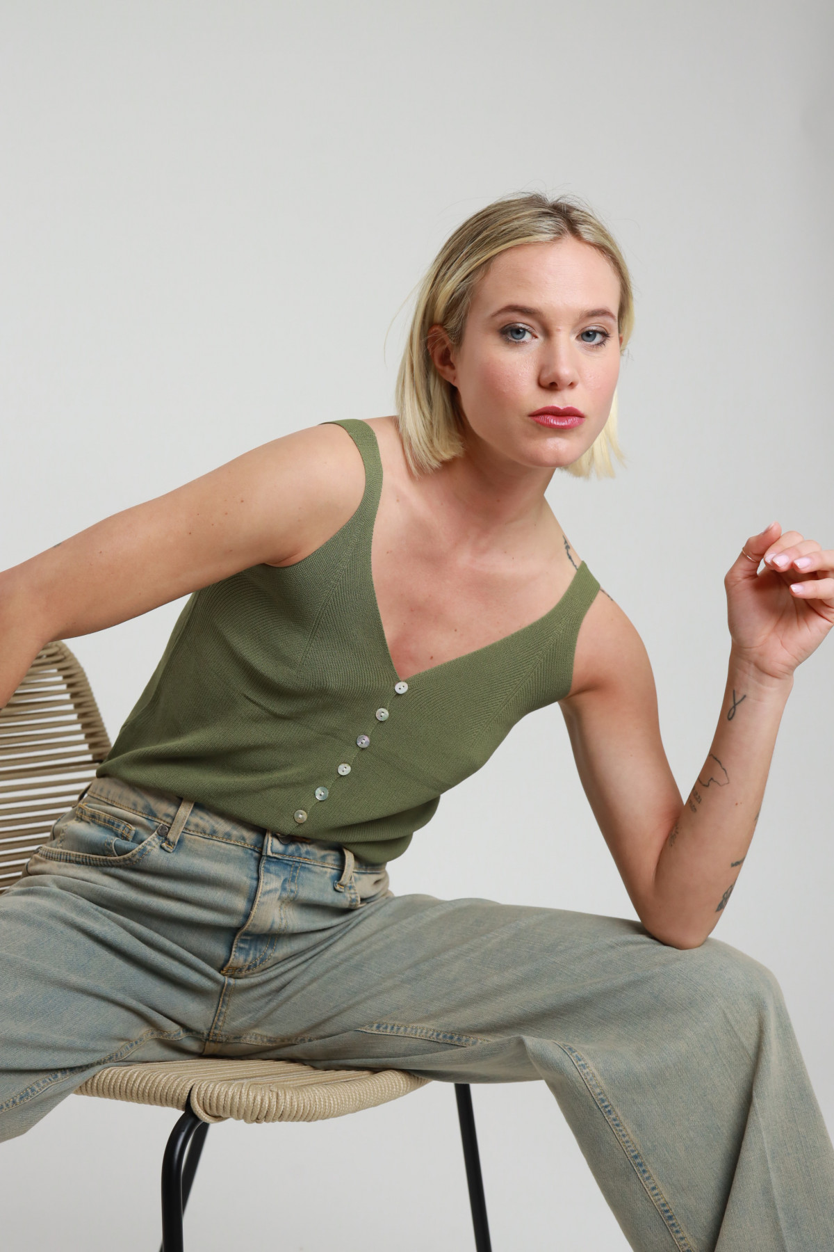 Canotta In Maglia Scollo V Con Bottoncini Sul Fronte.