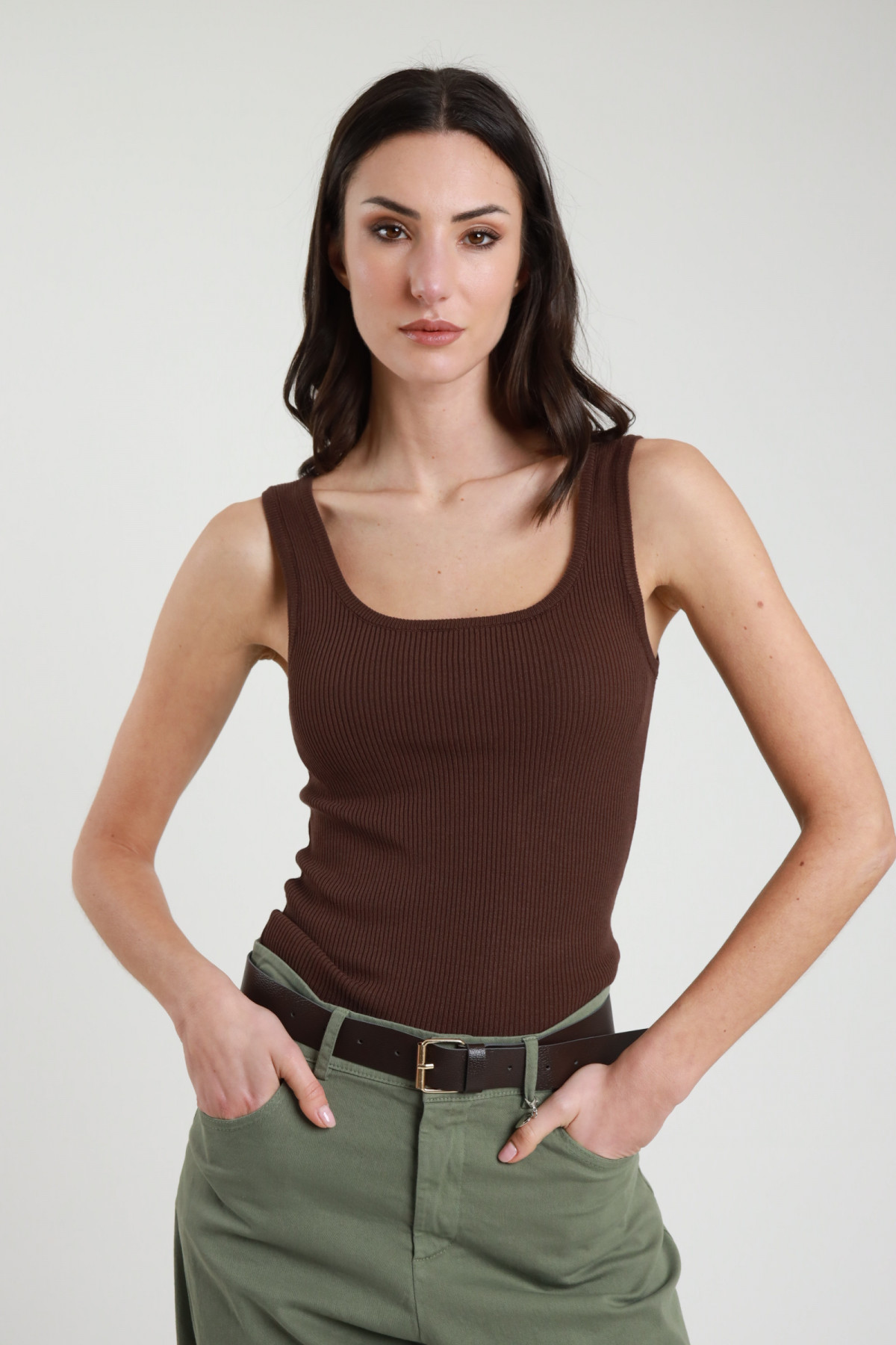 Canotta Elasticizzata a Costine con Scollo Quadrato. 70%vi 25%co 5%ea