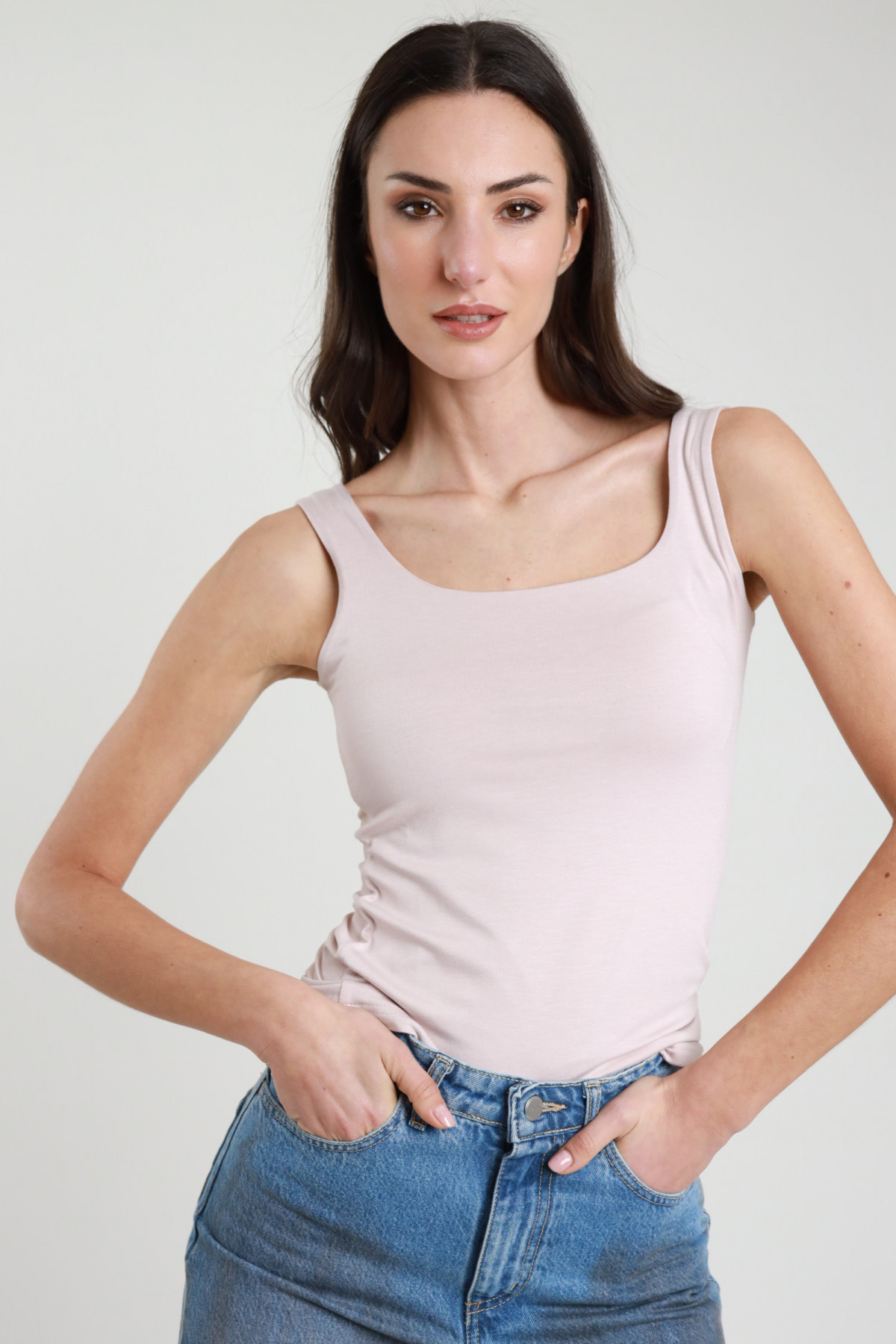 Elastisches, geripptes Tanktop mit quadratischem Ausschnitt. 70 %vi 25 %co 5 %ea