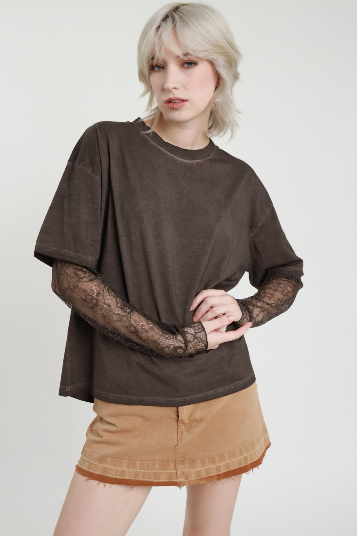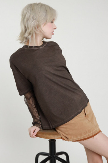 T-Shirt Mezze Maniche Girocollo in Cotone Tinto Freddo, con Maniche Lunghe in Pizzo.