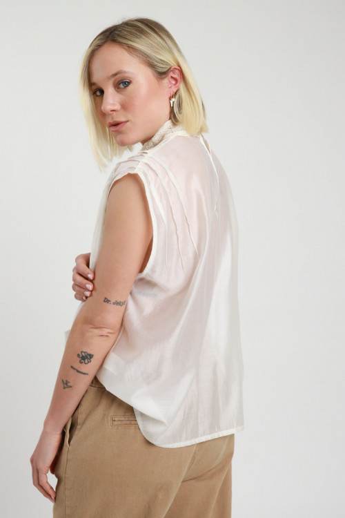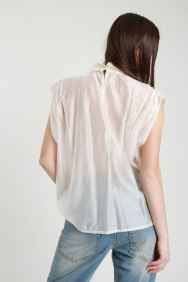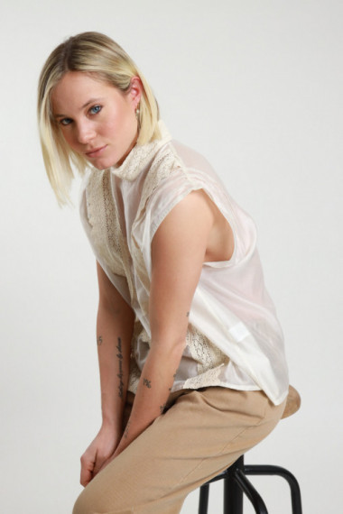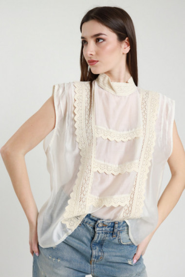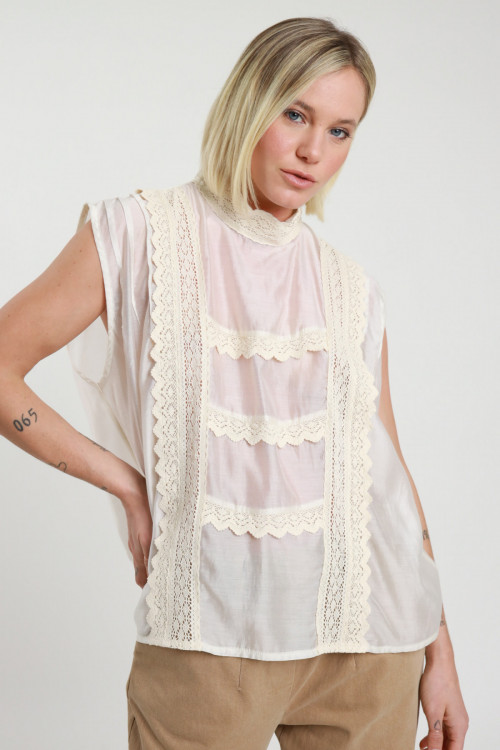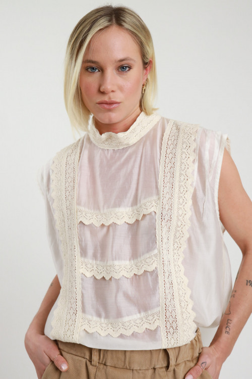 Top Semitrasparente Smanicato Con Colletto Alto e Merletti.