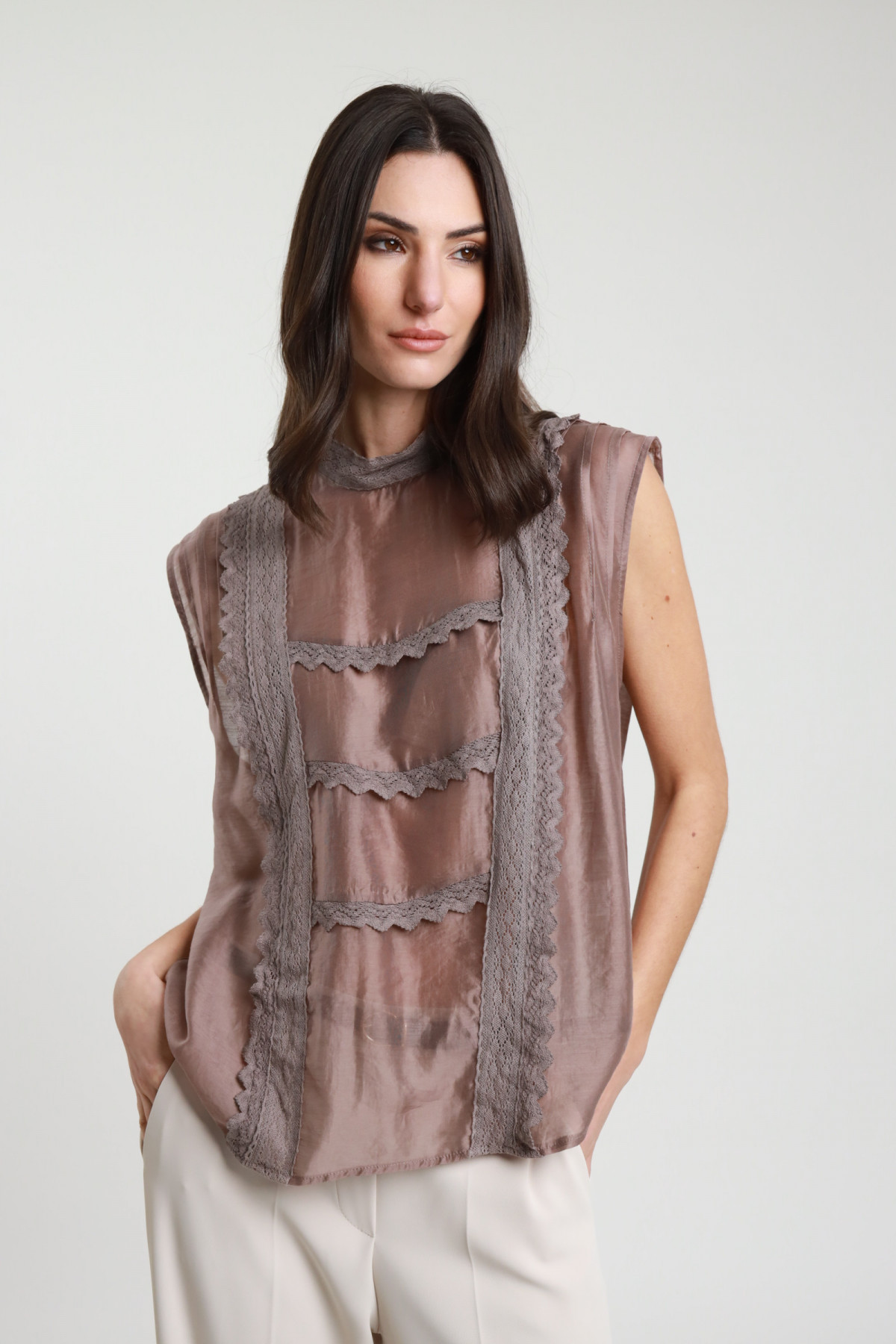 Top Semitrasparente Smanicato Con Colletto Alto e Merletti.