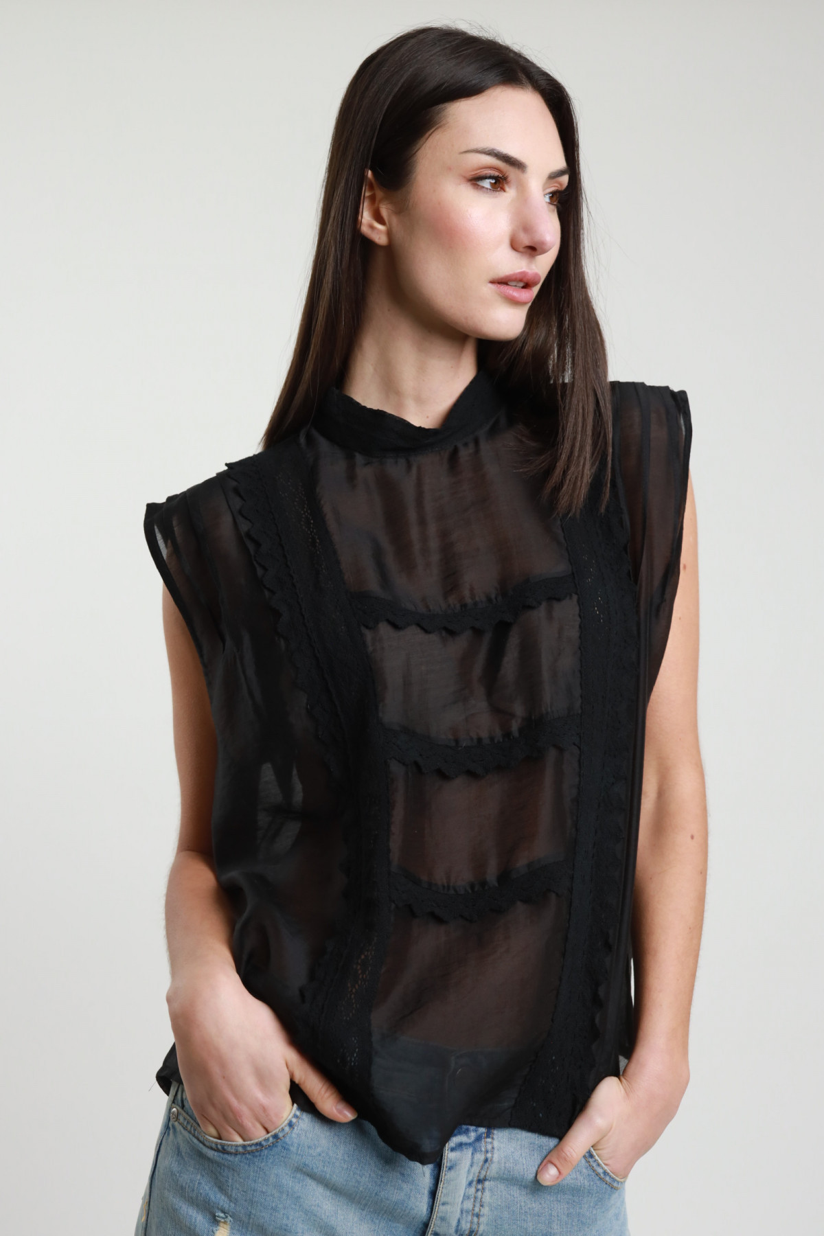 Top Semitrasparente Smanicato Con Colletto Alto e Merletti.