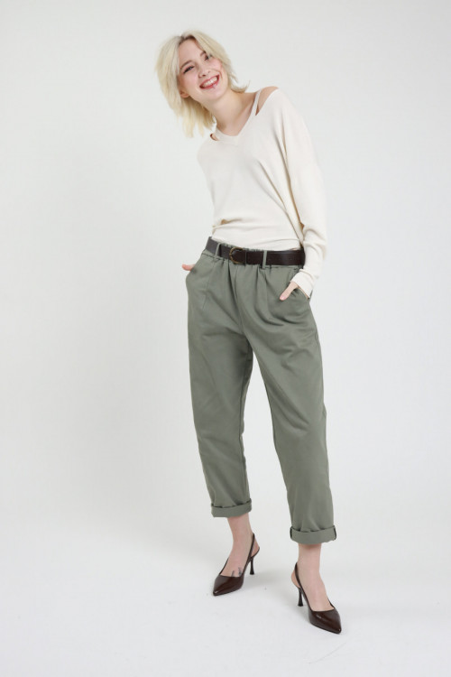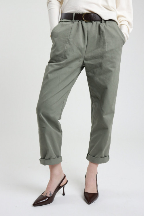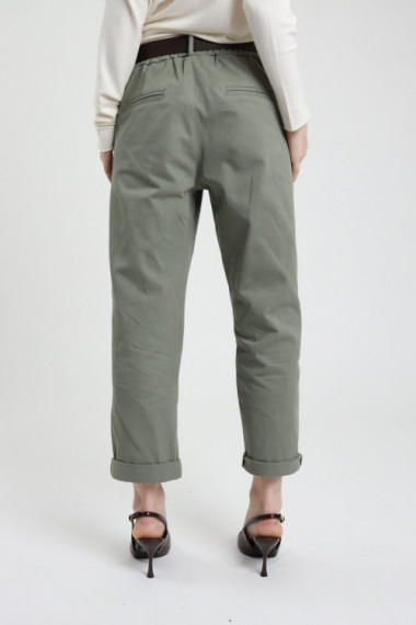 Pantalone Chino Scamosciato Con Tasche Oblique Sul Fronte, Gamba Morbida, Con Cuciture E Pences Sul Fronte. Chiusura Con Cerniera e Un Bottone, Passanti Per la cintura.