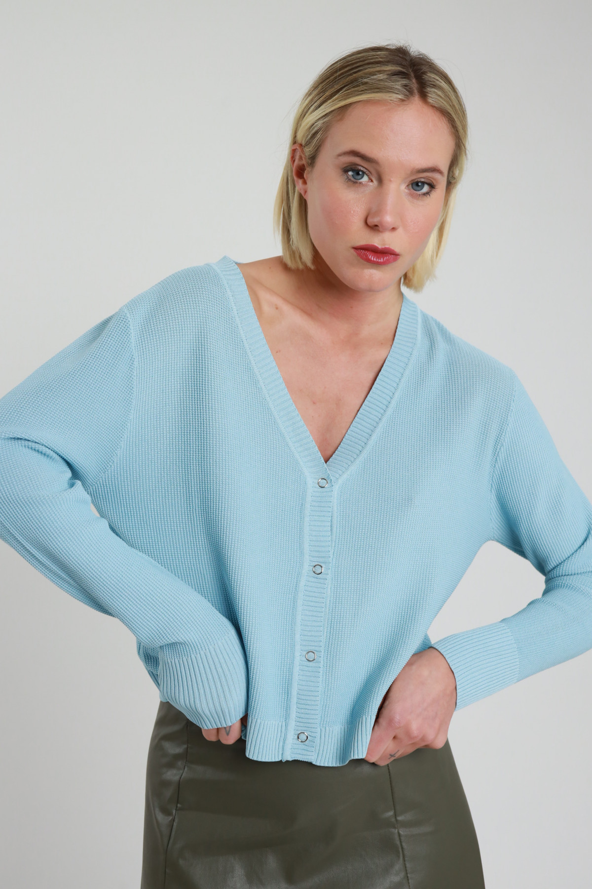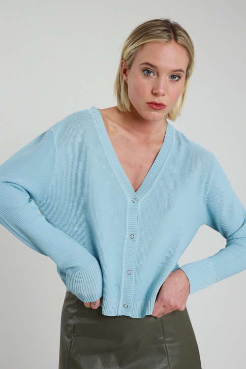 Cardigan Scollo a V, Tessuto a Trama, Bottoncini a Pressione.
