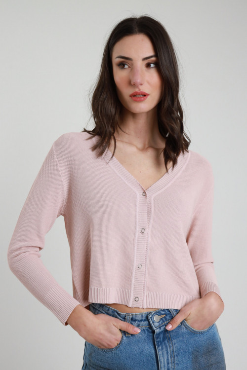 Cardigan Scollo a V, Tessuto a Trama, Bottoncini a Pressione.