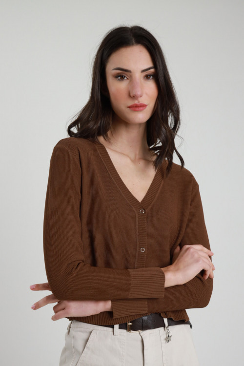 Cardigan Scollo a V, Tessuto a Trama, Bottoncini a Pressione.