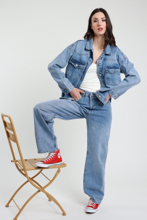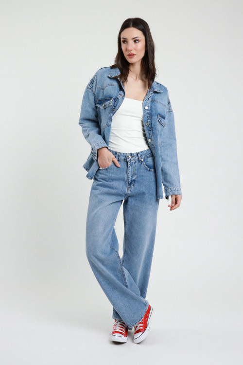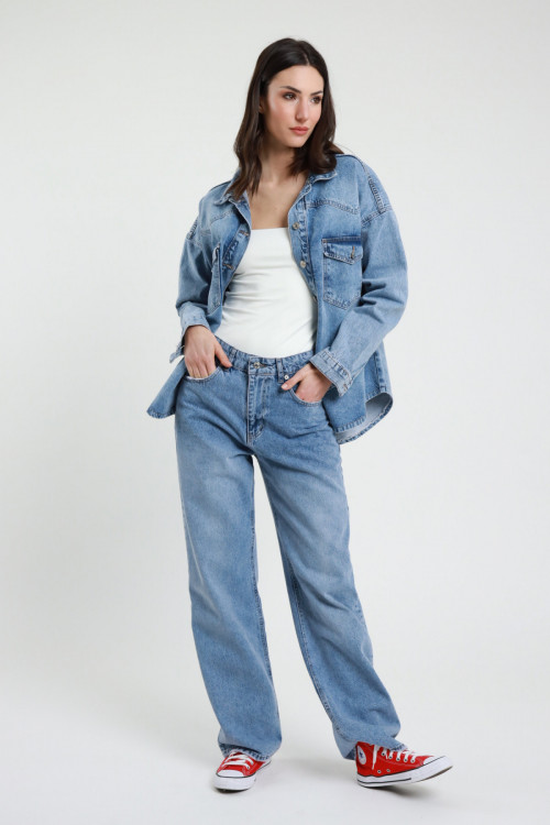 Giacca Camicia Taglio Over in Denim con Sbiaditure e Chiusura Bottoni.