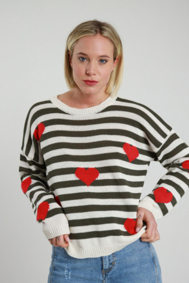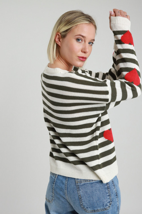 Maglia Girocollo A Righe e Con Cuori, Spalla Scesa, Fit Leggermente Over.