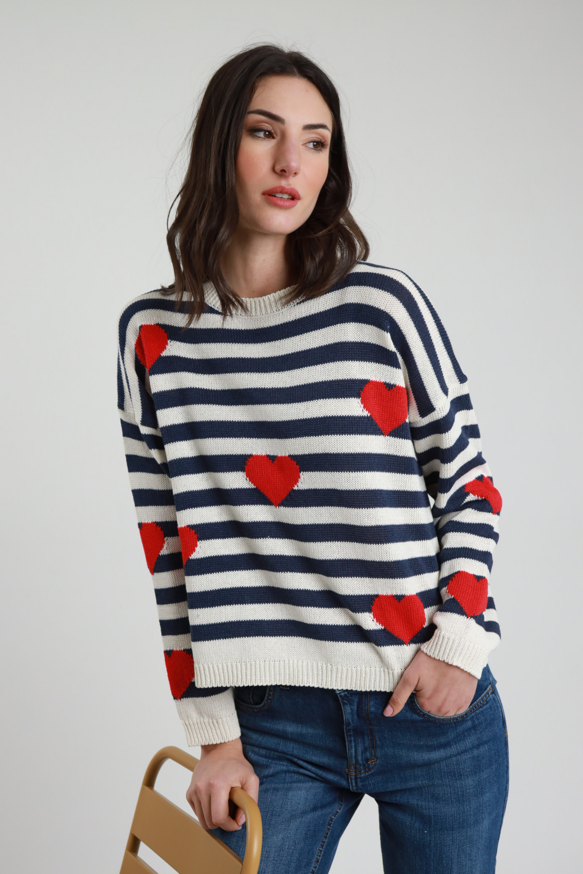 Maglia Girocollo A Righe e Con Cuori, Spalla Scesa, Fit Leggermente Over.